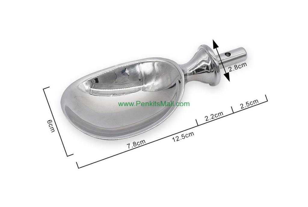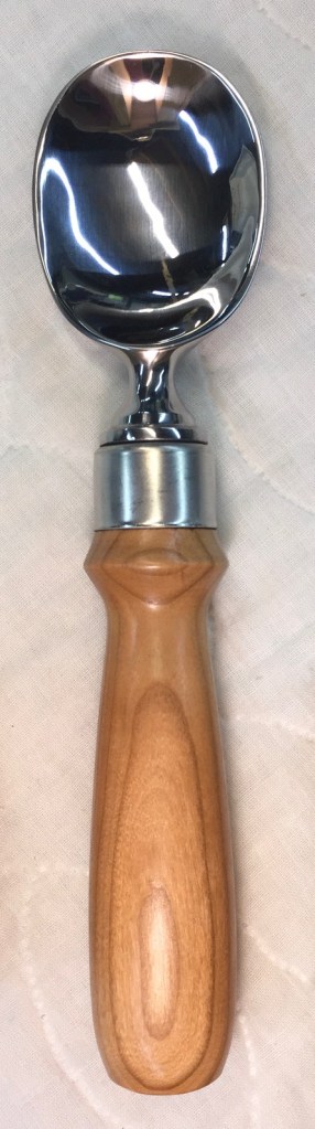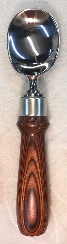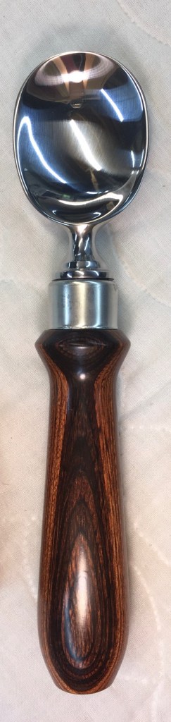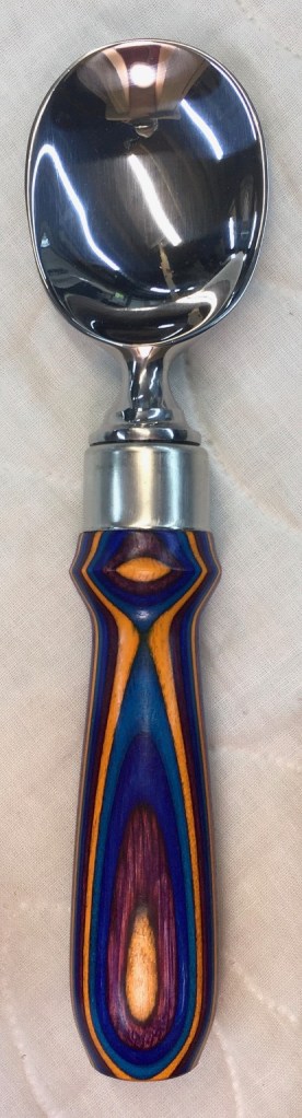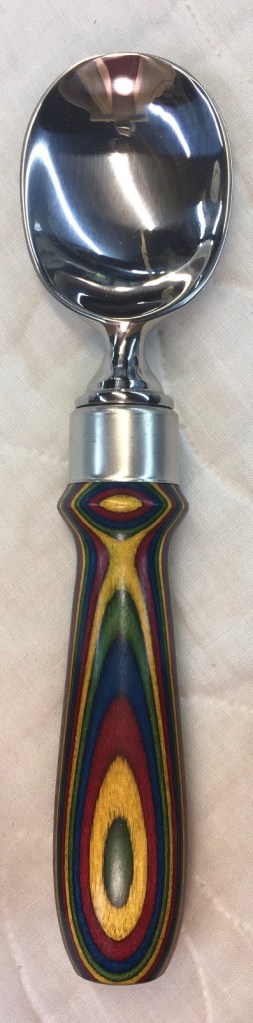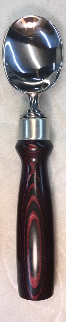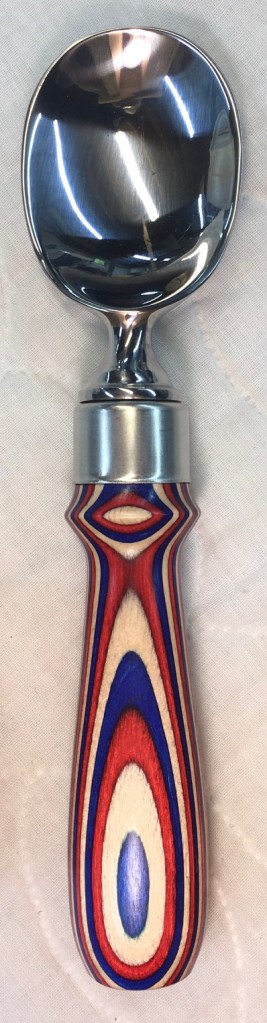 These scoops have a large stainless steel paddle head and ferrule (see dimensions below). The handles are made from dyed plywood, natural woods, and polymer-impregnated woods.