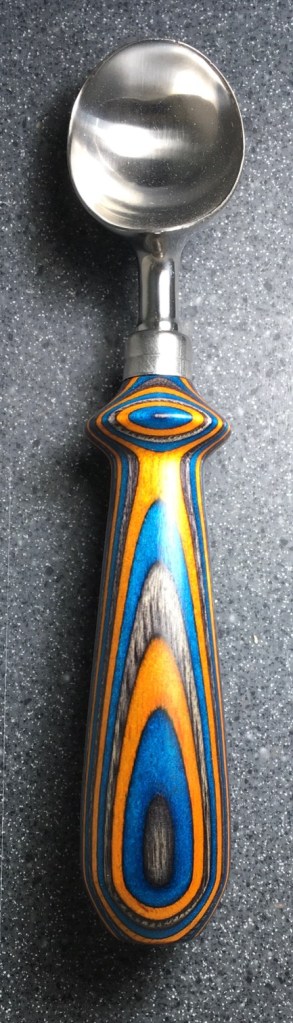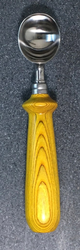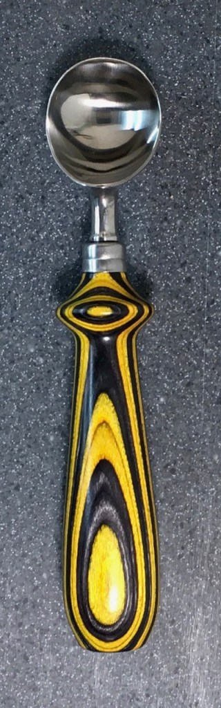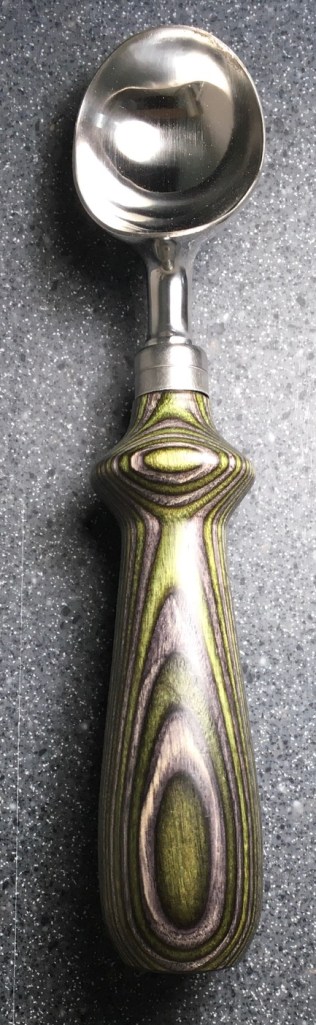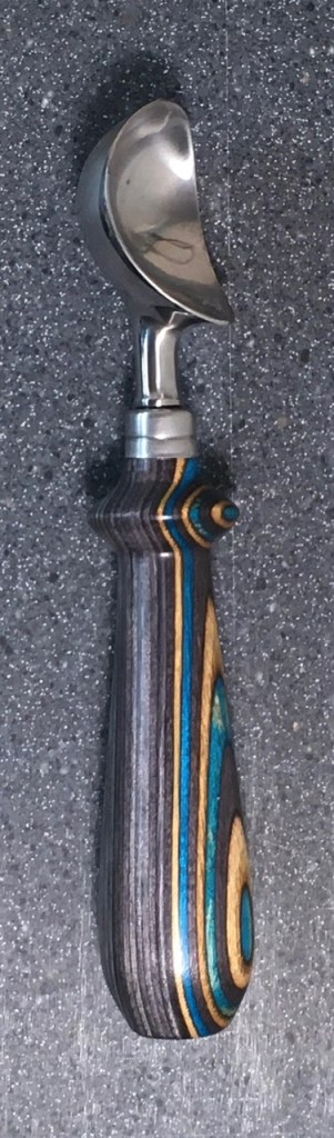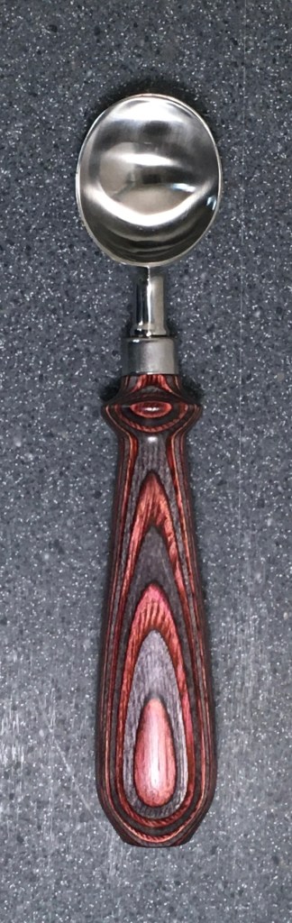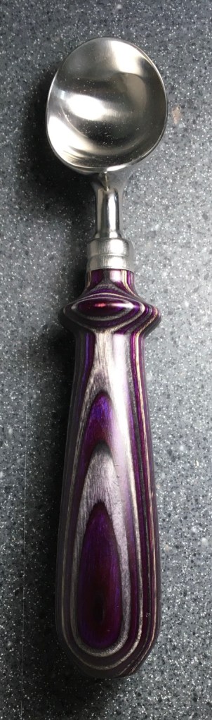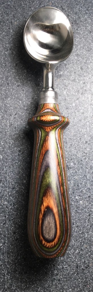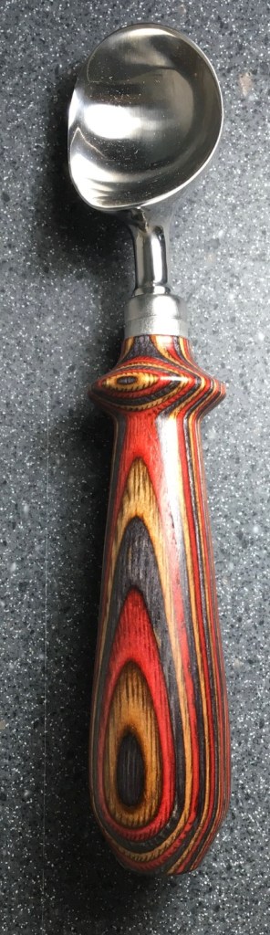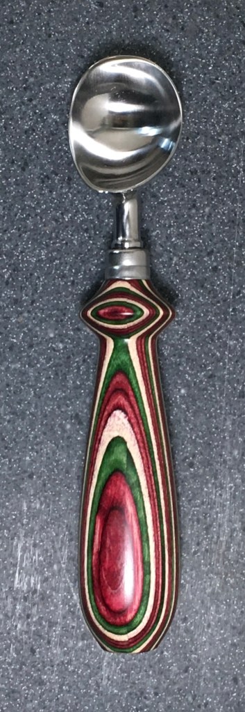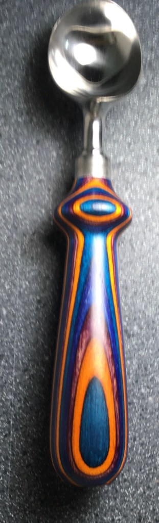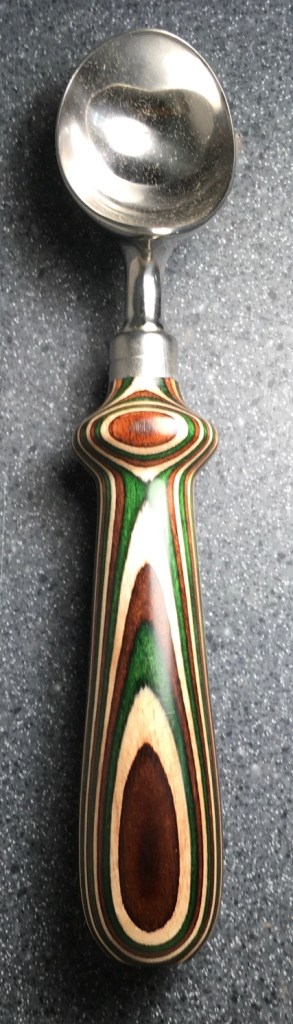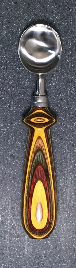 These scoop handles are made from a variety of wood blank types, including kiln dried wood as it comes from the tree (e.g., ambrosia maple), or wood that has been assembled from dyed layers of yellow birch and purchased as a multi-colored plywood. The handles are ~1.5 inches in diameter and ~6 inches long. I turn the handles on my lathe by hand before sanding and finishing with 3 coats of waterproof sealant. The stainless steel ferrule and scoop are epoxied to the handle, making the whole scoop solid, smooth, and water resistant.