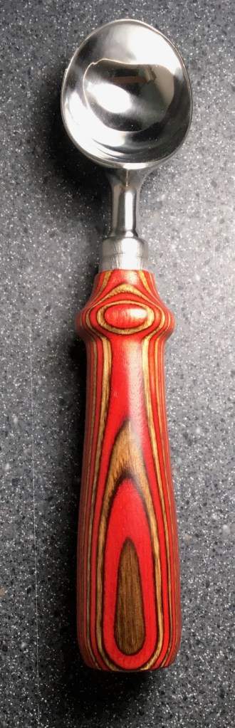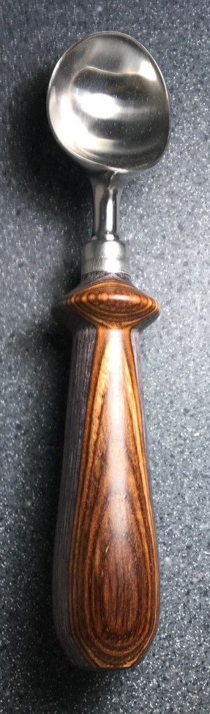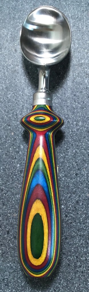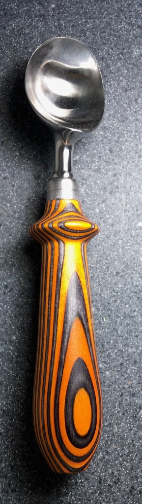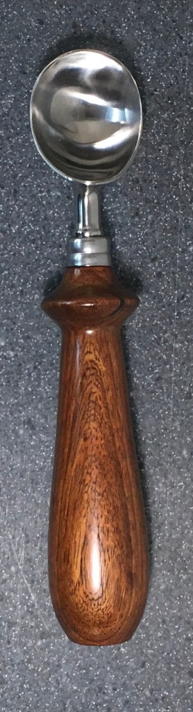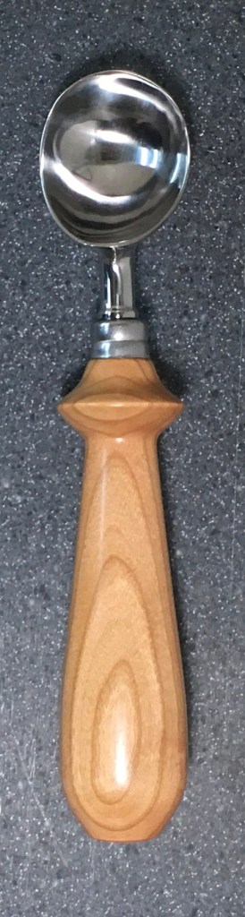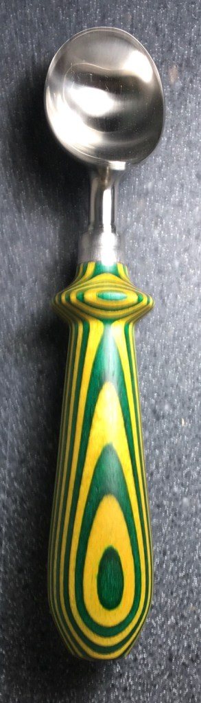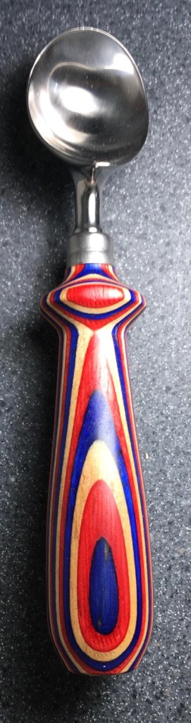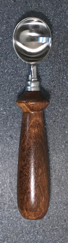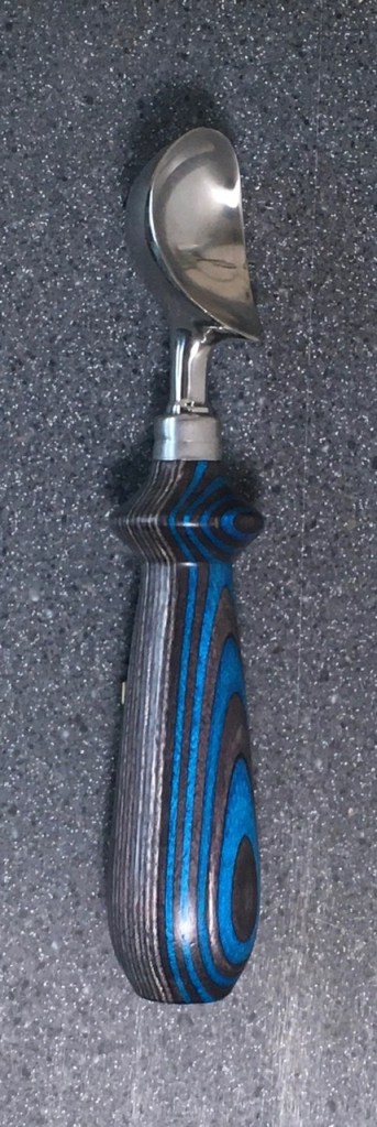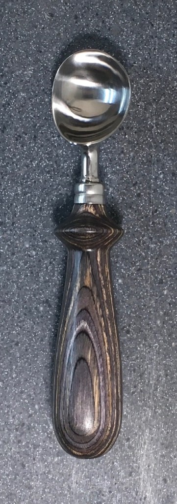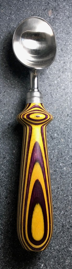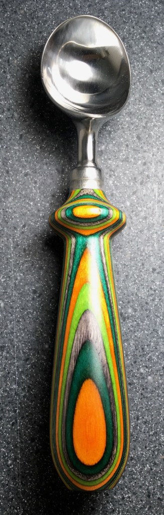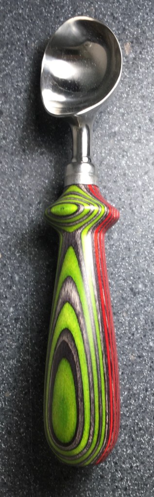 These scoop handles are made from a variety of wood blank types, including kiln dried wood as it comes from the tree (e.g., ambrosia maple), or wood that has been assembled from dyed layers of yellow birch and purchased as a multi-colored plywood. The handles are ~1.5 inches in diameter and ~6 inches long. I turn the handles on my lathe by hand before sanding and finishing with 3 coats of waterproof sealant. The stainless steel ferrule and scoop are epoxied to the handle, making the whole scoop solid, smooth, and water resistant.