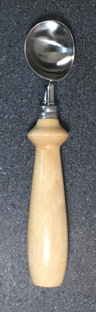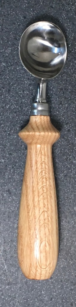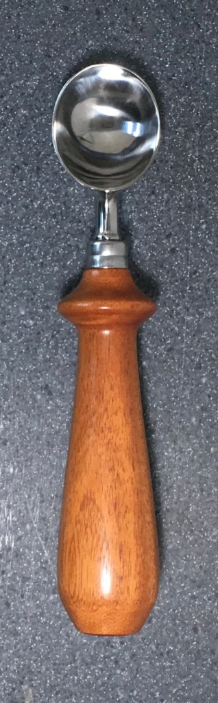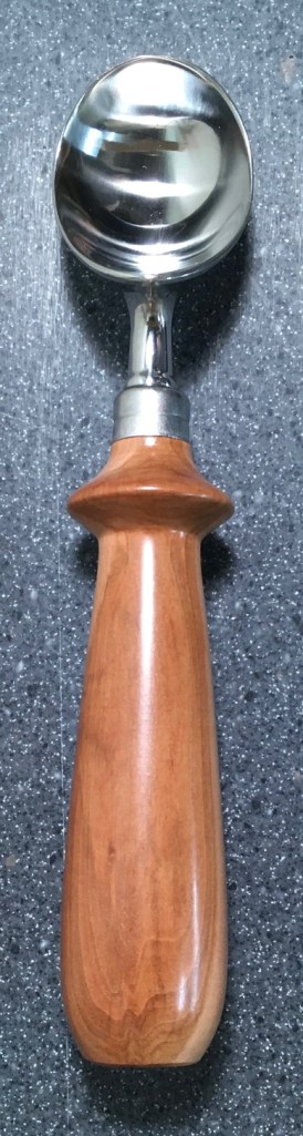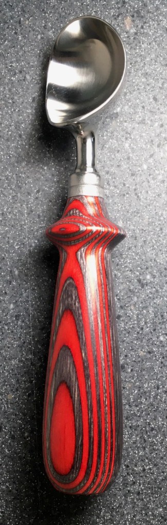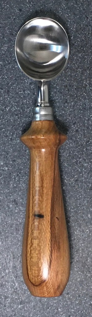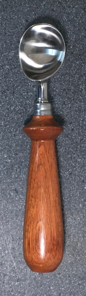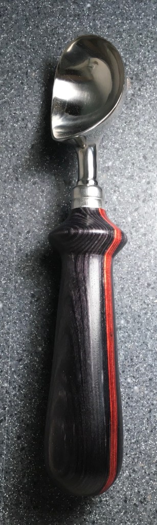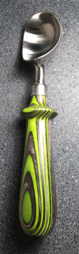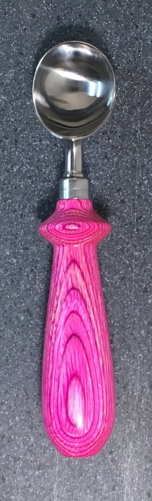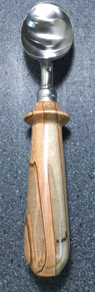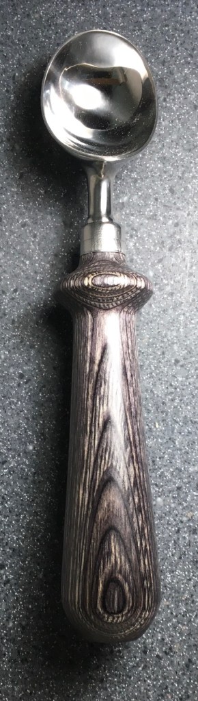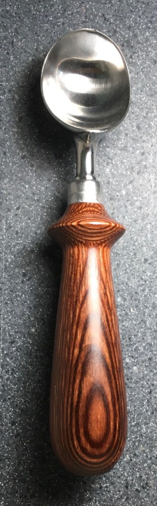 These scoop handles are made from a variety of wood blank types, including kiln dried wood as it comes from the tree (e.g., ambrosia maple), or wood that has been assembled from dyed layers of yellow birch and purchased as a multi-colored plywood. The handles are ~1.5 inches in diameter and ~6 inches long. I turn the handles on my lathe by hand before sanding and finishing with 3 coats of waterproof sealant. The stainless steel ferrule and scoop are epoxied to the handle, making the whole scoop solid, smooth, and water resistant.