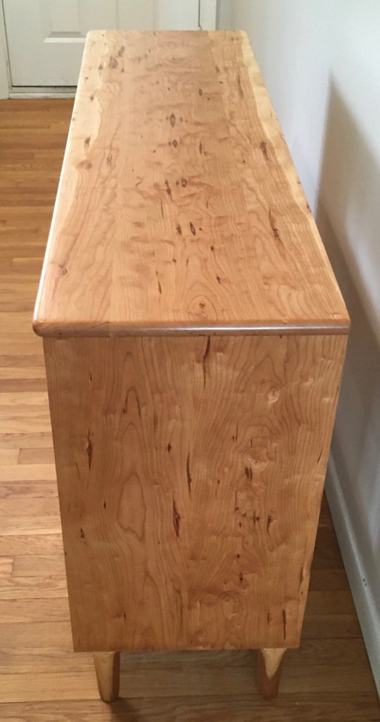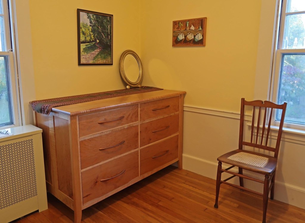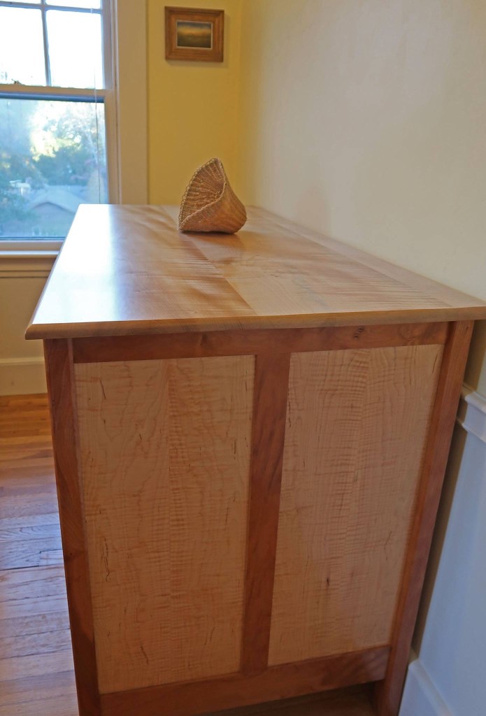 These cherry and curly maple bureaus were built as a set of 2 with complimentary arrangements of the woods. The design is simple, and accented by the slight flair of the front legs. The handles are copper, complementing the rich cherry hue.