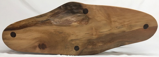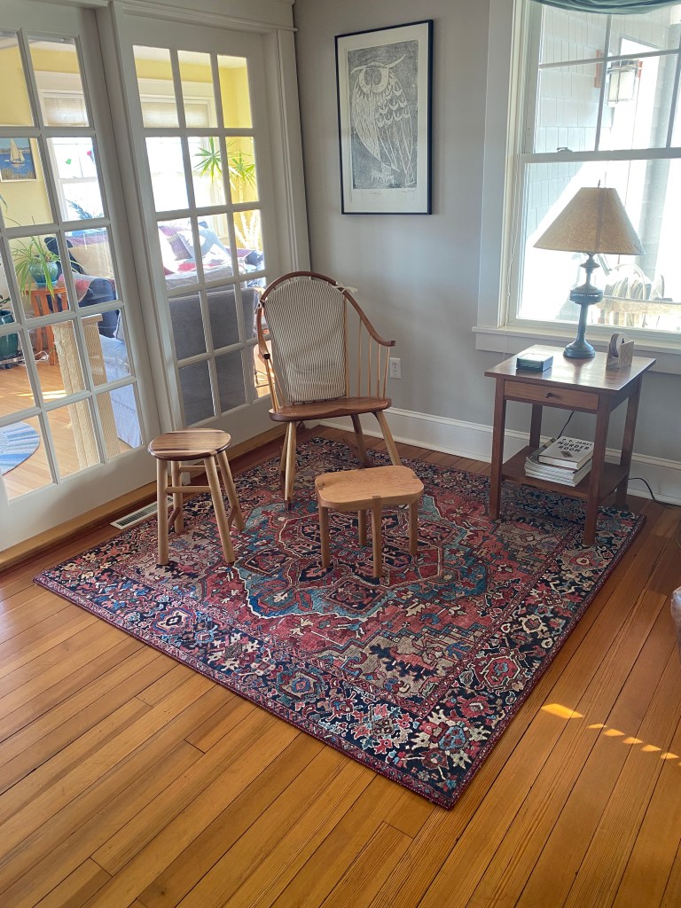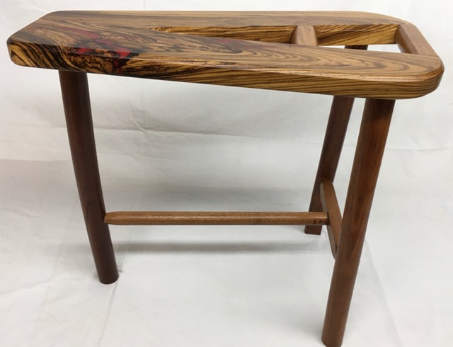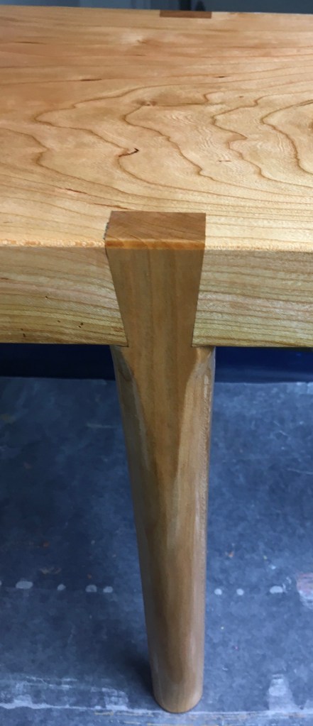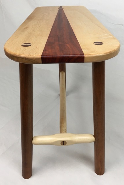 This cherry footstool is made from a 1-5/8″ thick slab. The cherry legs were turned on the lathe and are attached to the middle of each side using a half dovetail.