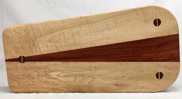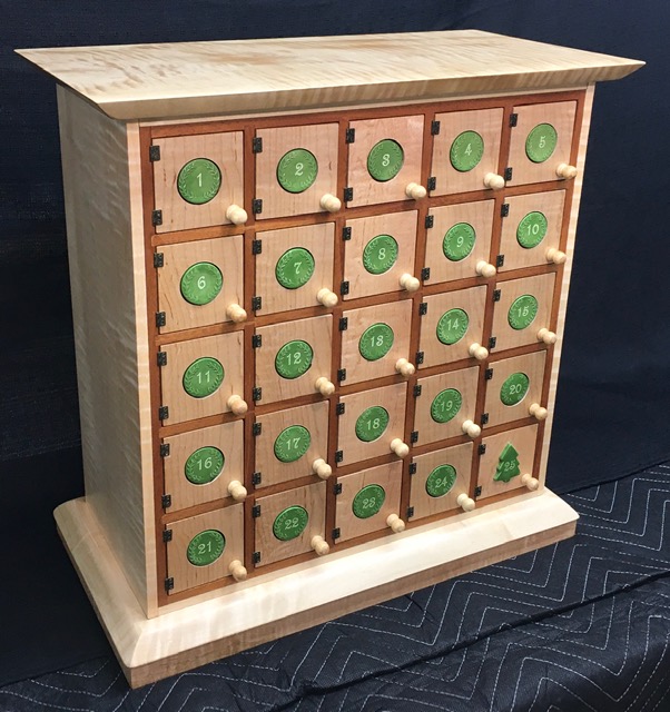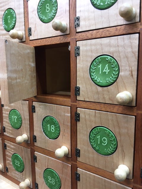 Each of the doors of this Advent calendar is 3″ x 3″ curly maple framed by mahogany to make a small cubbyhole for a daily December gift through Christmas. The beveled top and base direct attention to the doors, each of which has a glazed green ceramic number for the date.
