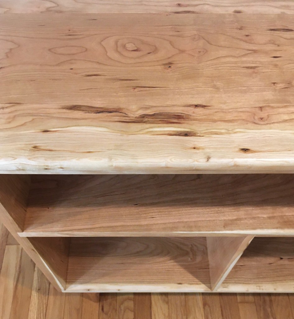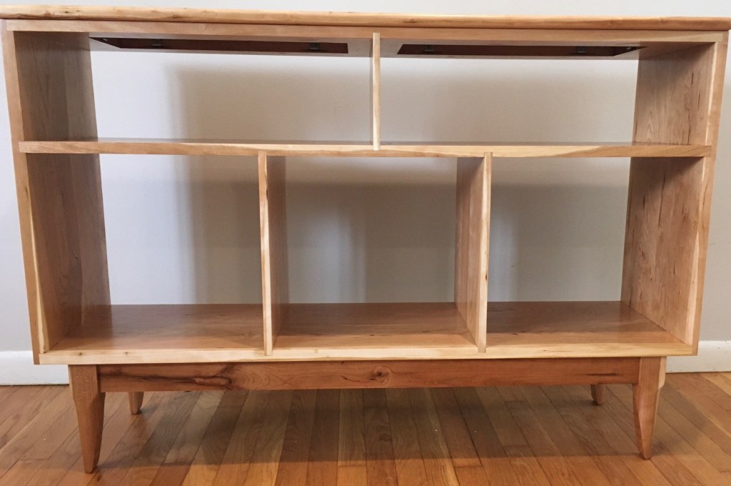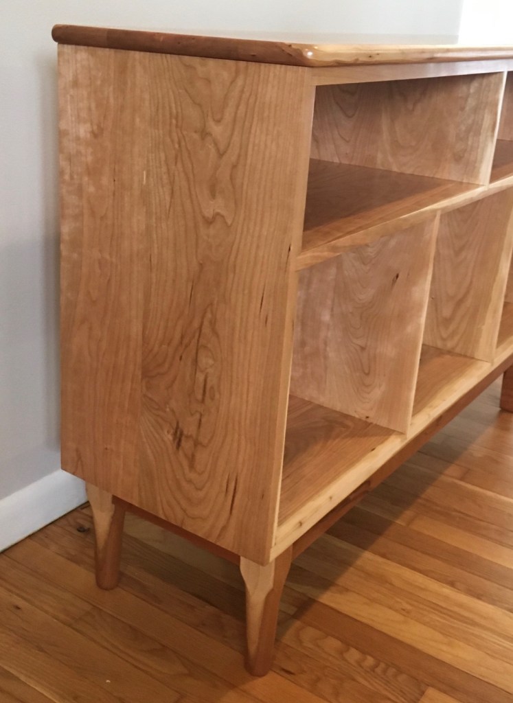 The design of this record cabinet was driven by a wish to display a variety of wood color (heartwood and sapwood), sap pockets, and distinctive knots (one filled with copper dust in epoxy) to give a lively and complex character.